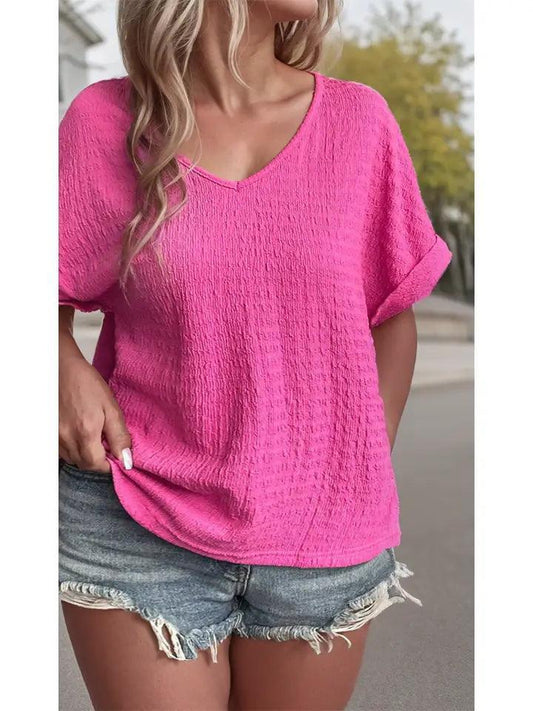 Plus Size Textured Folded Sleeve V Neck Shirt
