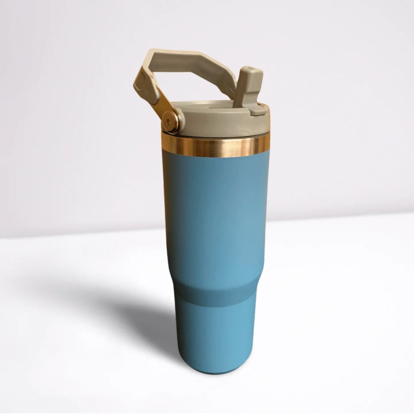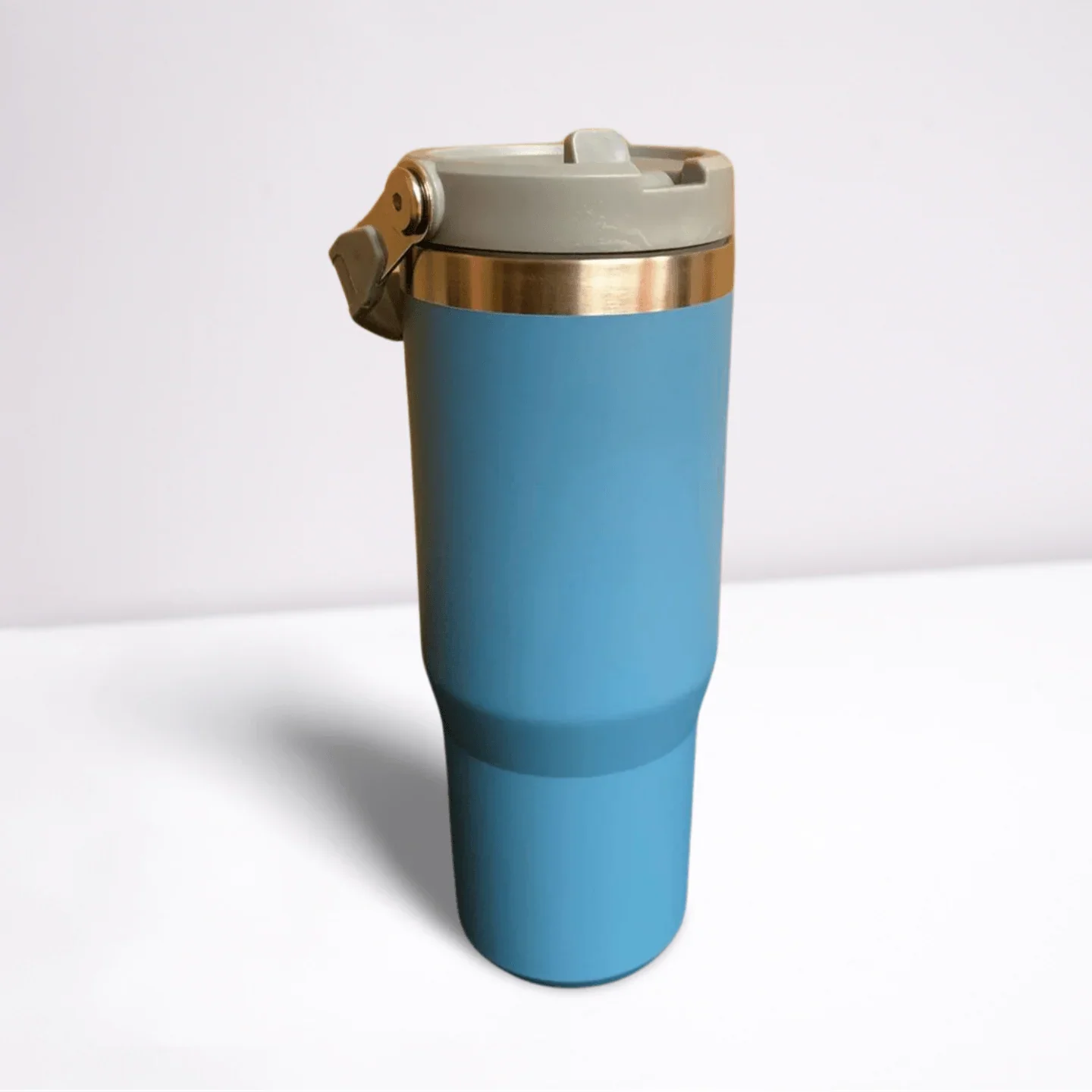 Introducing the 30OZ Stainless Steel Flip Straw Tumbler in a stunning blue-grey finish. This tumbler features double wall vacuum insulation, ensuring your beverages stay hot or cold for hours.