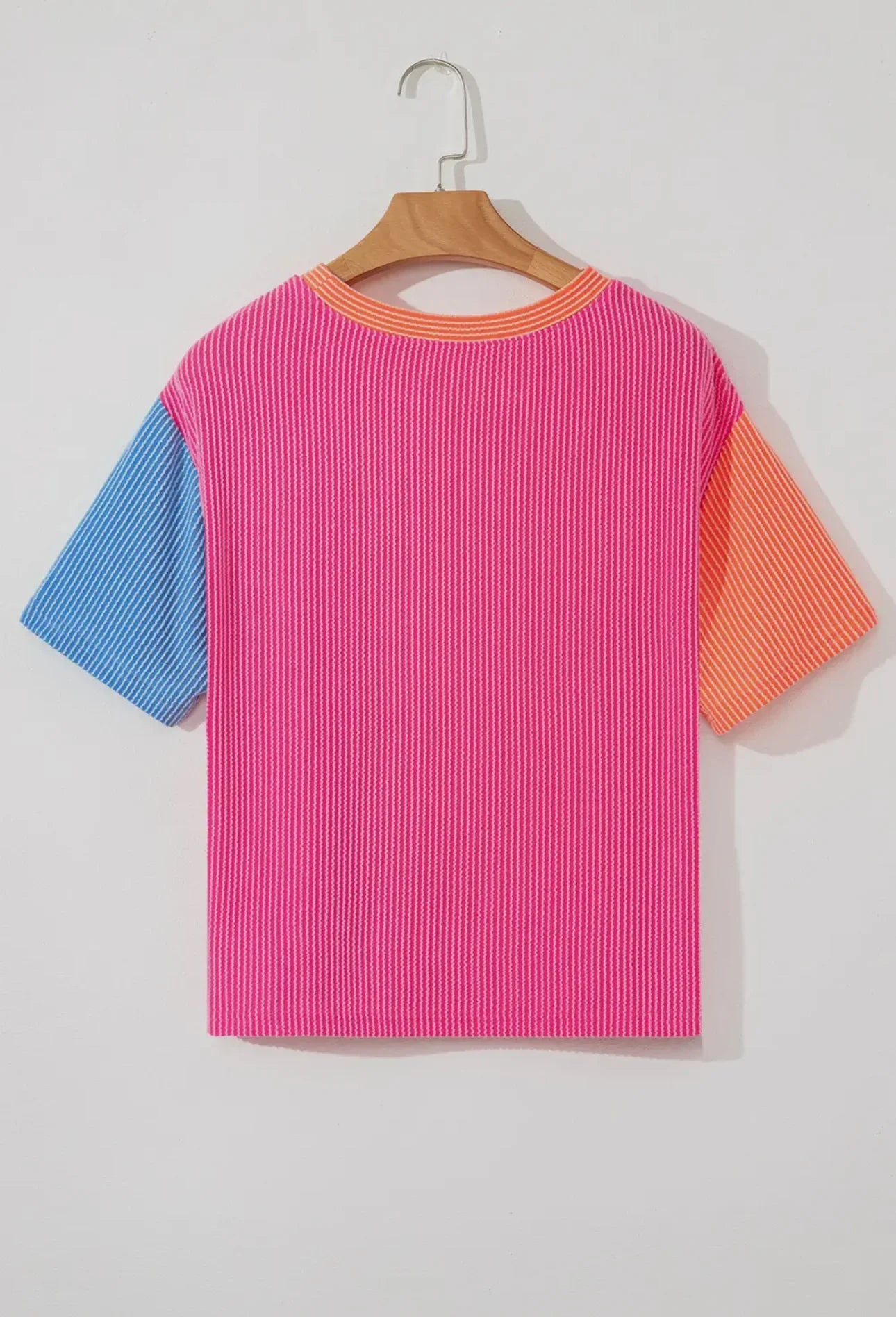 The flattering color-block pattern makes it a versatile piece, perfect for dressing up or down. Whether you're heading to brunch or running errands, this tee ensures you look chic and feel comfortable.
