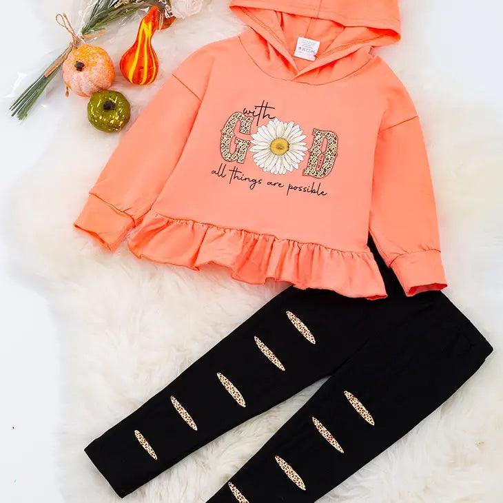Discover the inspiring 'With God All Things Are Possible' 2 Pc Set, available at Kentucky Belle Boutique. This stylish ensemble features a vibrant orange tunic with a cozy hoodie and charming ruffle details, perfect for any casual outing.